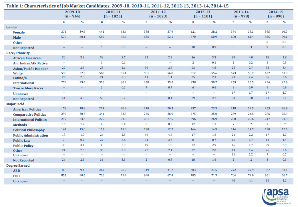 View APSA’s Data on the Profession archived on the APSA website with more reports on enrollments, salaries, placements and more!