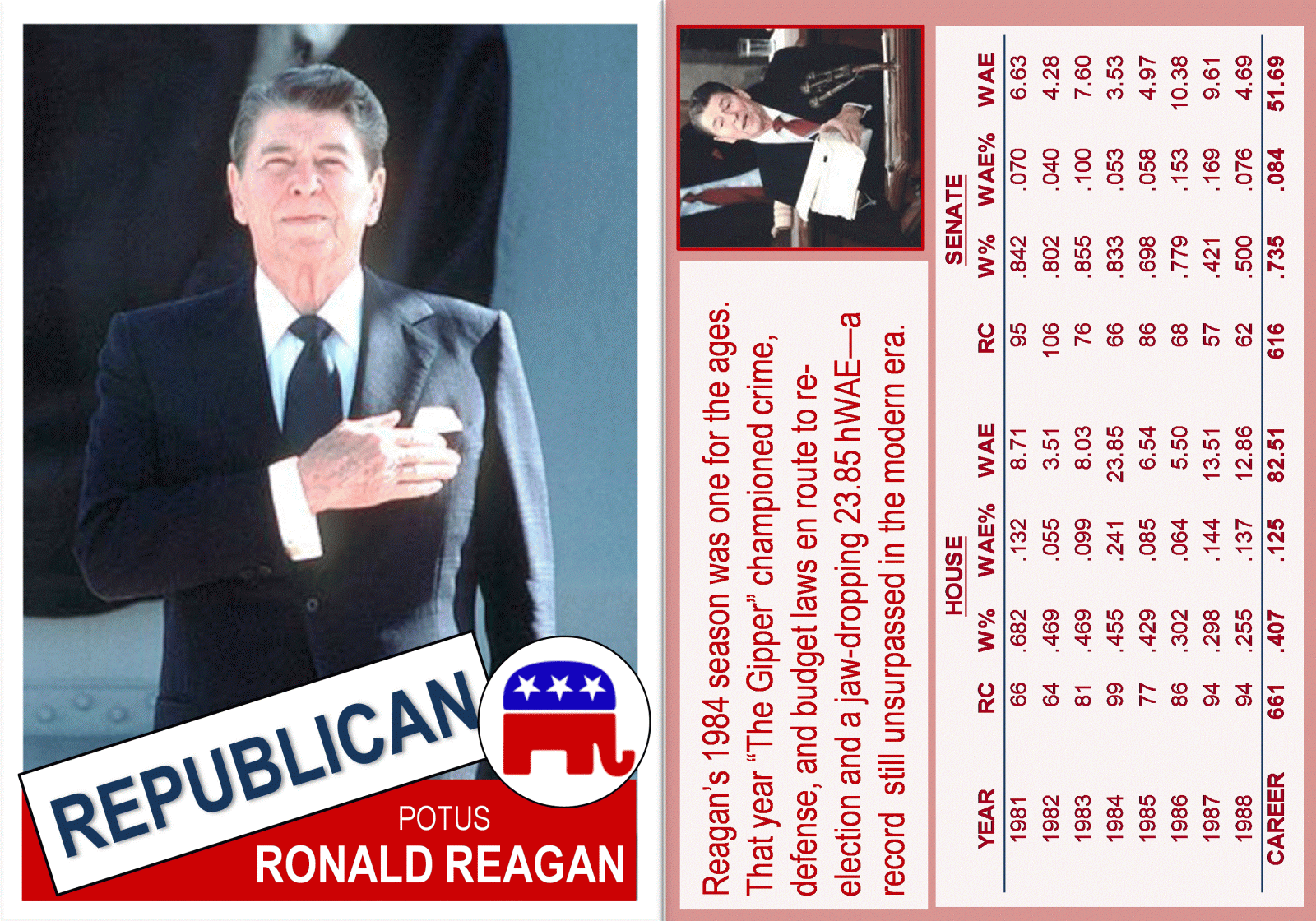 We observe some parallels between presidential-congressional relations and baseball. Like baseball, presidential-congressional politics is all about winning. What a baseball manager needs from his players is runs: hitters must score runs; fielders must prevent them. What a president needs from members of Congress is votes: votes for and against legislation, votes to sustain vetoes, and (every century or so) votes opposing impeachment. But what fans (of sports and politics) find most intriguing is Wins Above Expectations (WAE)—did the team do better or worse than expected? Baseball analysts use sabermetrics to develop objective metrics to assess teams and players. Political scientists use traditional statistical models to analyze presidential success in Congress. This paper adapts the Pythagorean Expectations (PE) formula from sabermetrics to assess presidential legislative success from Eisenhower to Obama. We find that a parsimonious regression model and the PE formula both predict annual success rates with 90 percent accuracy. The estimates of WAE from the two approaches, however, are uncorrelated. Regression analysis does not identify any president who systematically exceeded expectations, but sabermetric analysis indicates that Republican presidents outperform Democrats. Neither approach correlates with recent presidential greatness rankings based on scholars’ assessments.